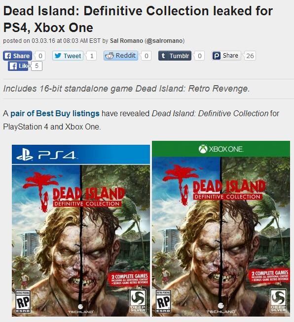 Best Buy在页面列出了PS4/XboxOne《死亡岛 最终版合辑》,上市日期标注为5月31日!本作包含《死亡岛 最终版》+《死亡岛 激流 最终版》,以及一个独立开的名为《死亡岛 : Retro Revenge》的16位游戏。
