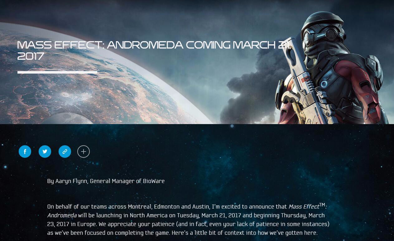 BioWare工作室总经理Aaryn Flynn在官方网站刊文,正式确定《质量效应 仙女座》将于2017年3月21日在北美发售,欧洲地区为3月23日! 以下官方网站页面连接: